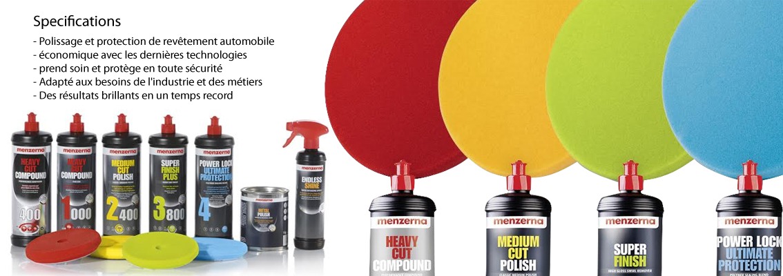 - Menzerna propose une gamme complète et éprouvée de produits de polissage automobile basée sur des normes de processus industriels. Il comprend des produits efficaces pour préparer la surface à polir, des pâtes à polir abrasives, des finitions pour produire des surfaces sans hologramme et un fini miroir, ainsi que des produits d'étanchéité à longue durée de vie, elle est complétée par une sélection cohérente d'accessoires et de tampons premium Menzerna. Grâce à l'utilisation des dernières technologies de polissage et des produits en une étape qui éliminent les étapes de processus, Menzerna s'assure que des résultats de haute qualité sont obtenus rapidement, ce qui conduit à des bénéfices plus élevés. Les produits Menzerna fonctionnent efficacement et sont faciles à utiliser manuellement ou avec des machines à polir excentriques et rotatives, sans développement de poussière. Menzerna combine une haute abrasivité et un brillant élevé dans des produits innovants en une étape. Cela établit de nouvelles normes en termes de temps de traitement pour le reconditionnement automobile. Le guidage clair de l'utilisateur par l'étiquetage des produits et la coordination des couleurs des étiquettes et des tampons aide l'utilisateur à naviguer en toute confiance à travers le processus de polissage.